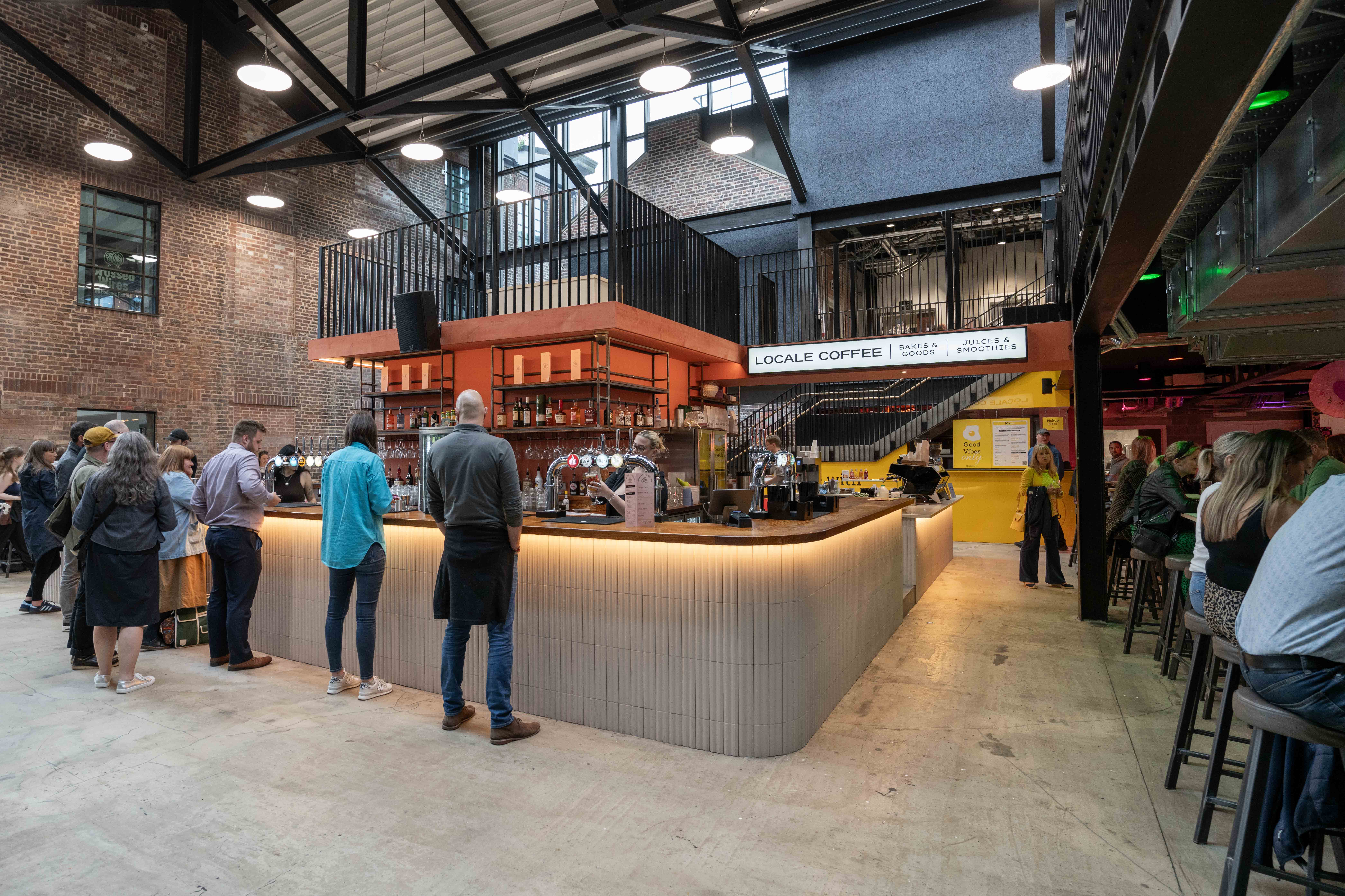Behind the historic frontage of Cambridge Street – now ready again to host independent shops, retailers, cafes, and bars, is the Cambridge Street Collective – Europe’s largest purpose-built food hall. A new dynamic social destination for Sheffield, the two storey space hosts bars, restaurants, a cookery school and a rooftop bar. Its industrial scale and feel is reinforced by its raw fabric and finish, which is designed as a flexible canvas to accommodate a mix of requirements, including coffee meet ups and afterwork drinks, festivals, and cookery demonstrations. The black steel interior detailing and corten exterior cladding highlights its modern and industrial aesthetic. This element of the development also integrates a historic site, the Bethel Chapel, which has been sensitively restored to maintain its architectural integrity while being repurposed for use as a live entertainment venue. The development creates a dynamic space that encourages local engagement and community interaction, enhancing the vibrancy of the area.